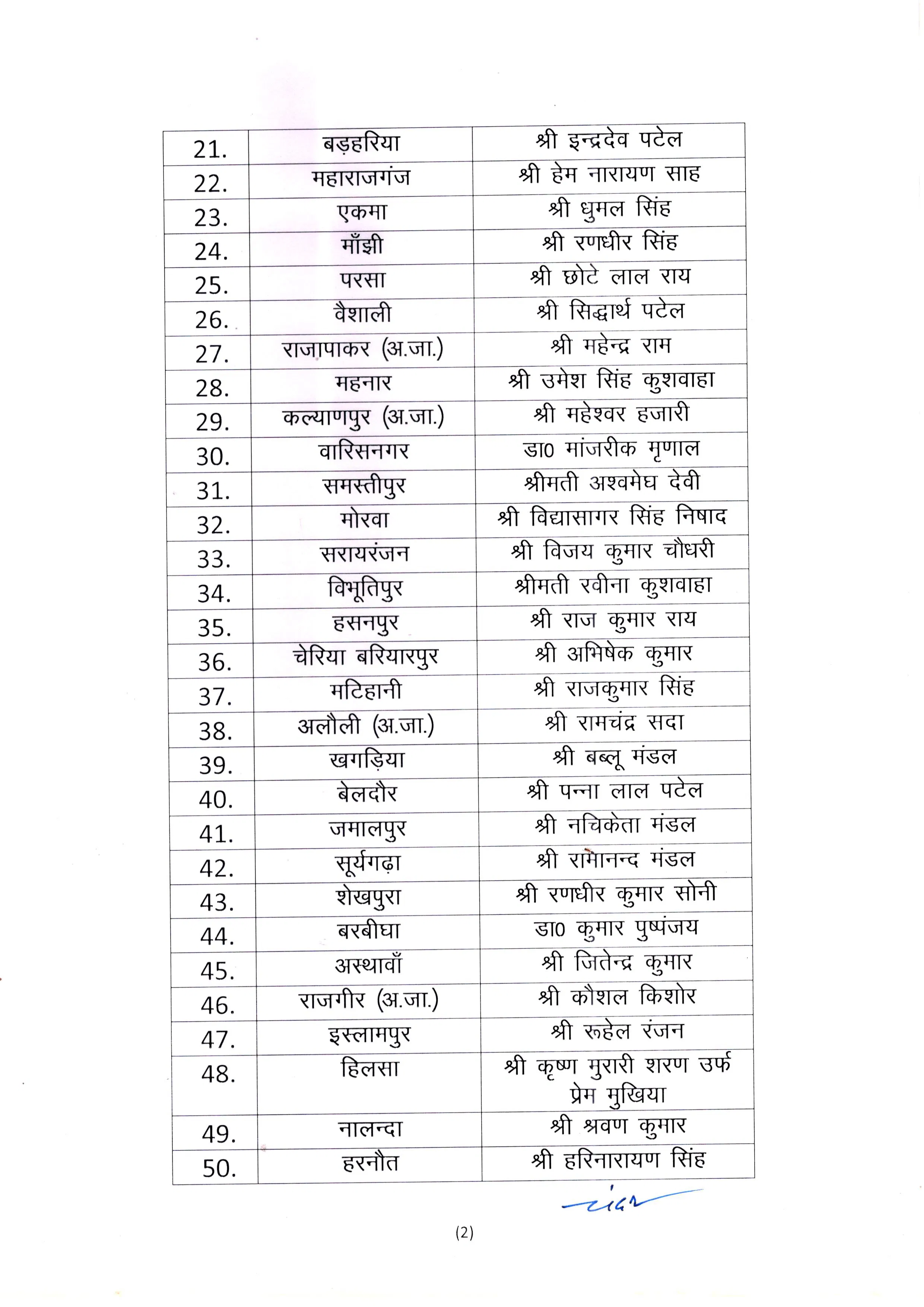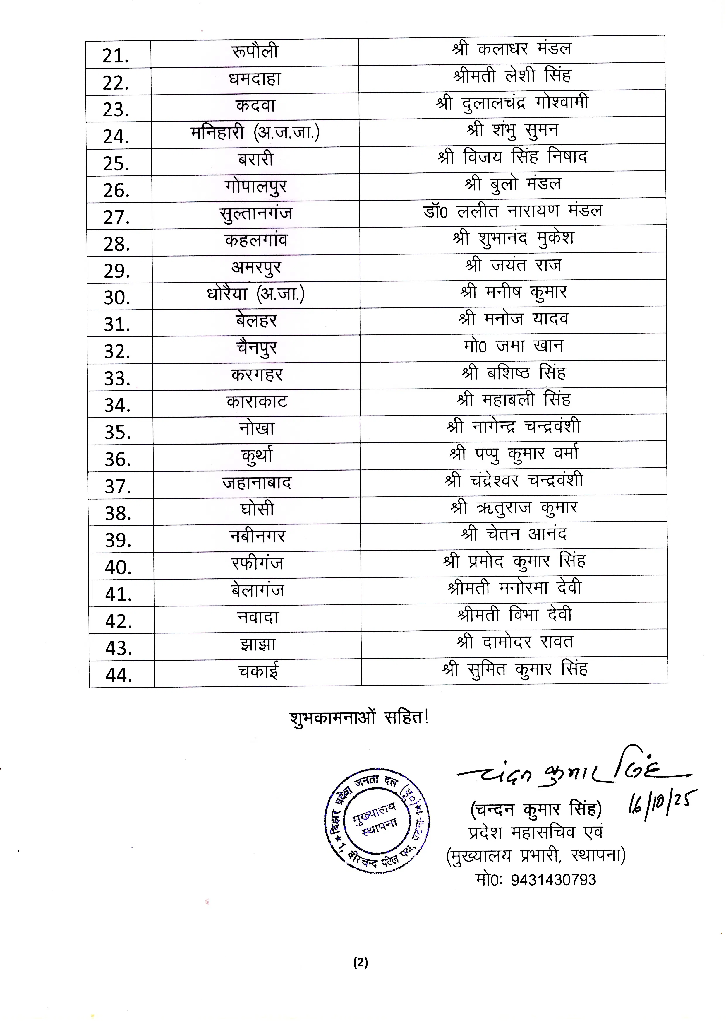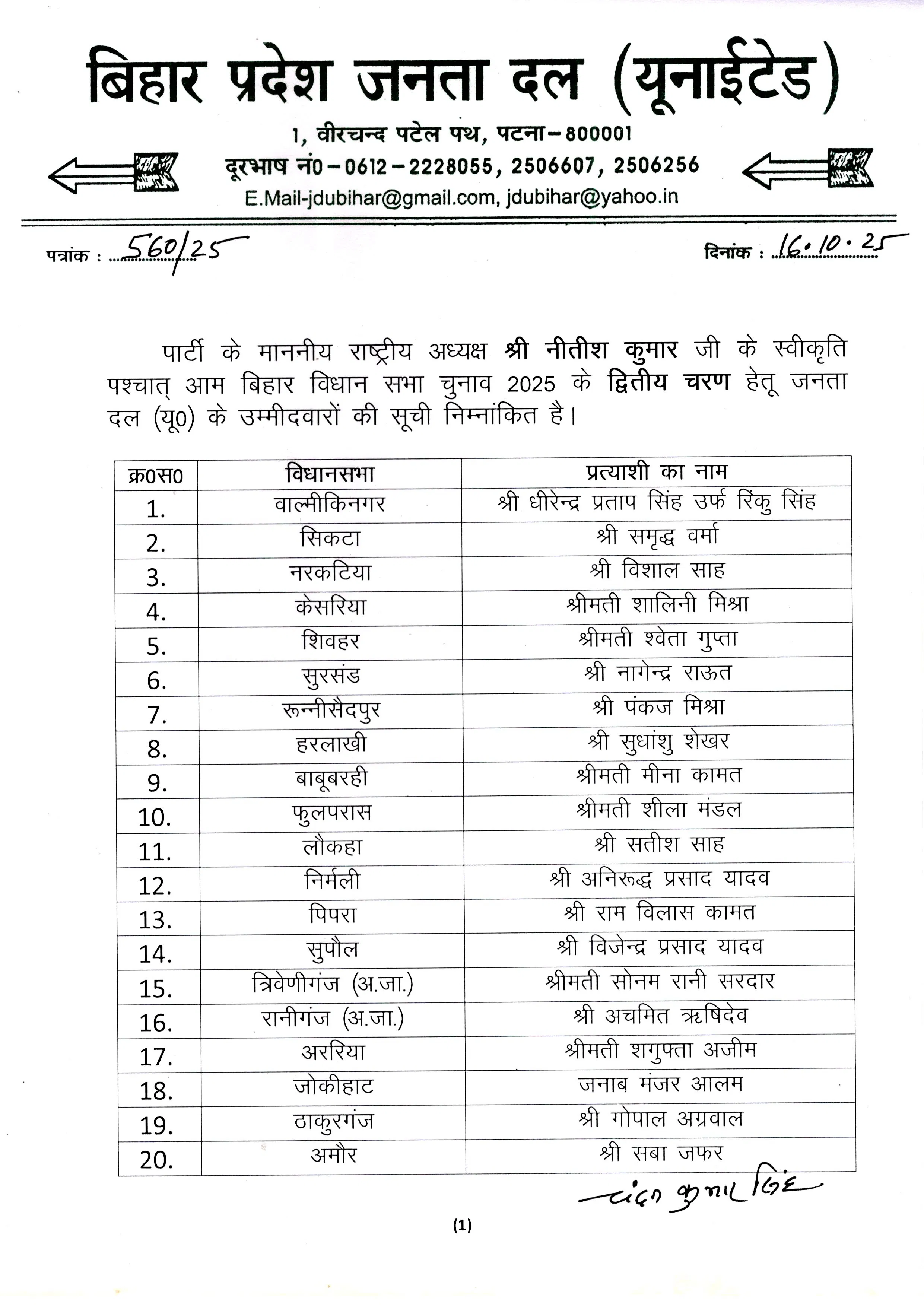 बिहार विधानसभा चुनाव 2025 के लिए जनता दल (यूनाइटेड) ने अपने सभी 101 उम्मीदवारों के नामों की घोषणा कर दी है। पार्टी ने बुधवार को दूसरी सूची जारी करते हुए 44 उम्मीदवारों के नाम घोषित किए, जबकि पहली सूची में 57 नाम पहले ही जारी किए जा चुके थे।