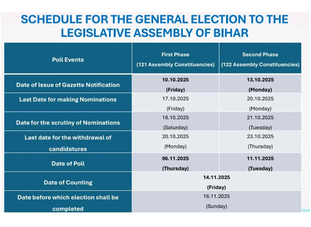 बिहार में विधानसभा चुनाव की तारीखों का औपचारिक ऐलान कर दिया गया है. मुख्य चुनाव आयुक्त ज्ञानेश कुमार ने रविवार को प्रेस कॉन्फ्रेंस कर बताया कि राज्य में चुनाव दो चरणों में होंगे. पहले चरण का मतदान 6 नवंबर, और दूसरे चरण का मतदान 11 नवंबर को होगा। नतीजे 14 नवंबर को घोषित किए जाएंगे. चुनाव तारीखों के ऐलान के साथ ही आचार संहिता पूरे राज्य में लागू हो गई है.